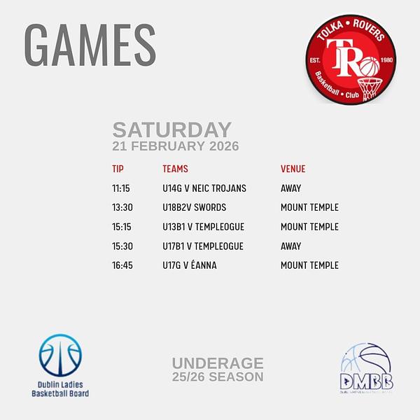 These are Underage games from across the Club for the weekend coming 21/22 February 2026
