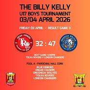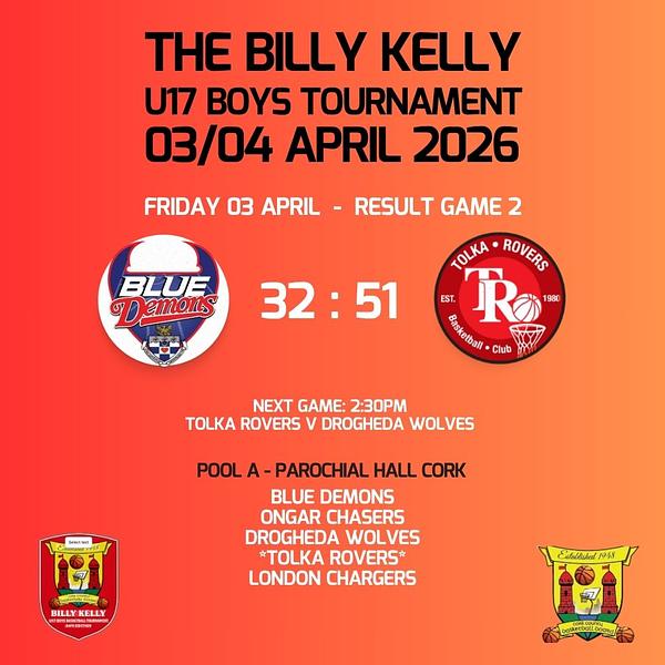 GAME 2 update from the Billy Kelly Tournament at Parochial Hall, Gurranabraher, Co Cork. The Tolka Rovers U17 Boys have won their second of 4 games they will play today, coming out on top of Blue Demons Basketball Club - Drogheda Wolves tips at 230pm.