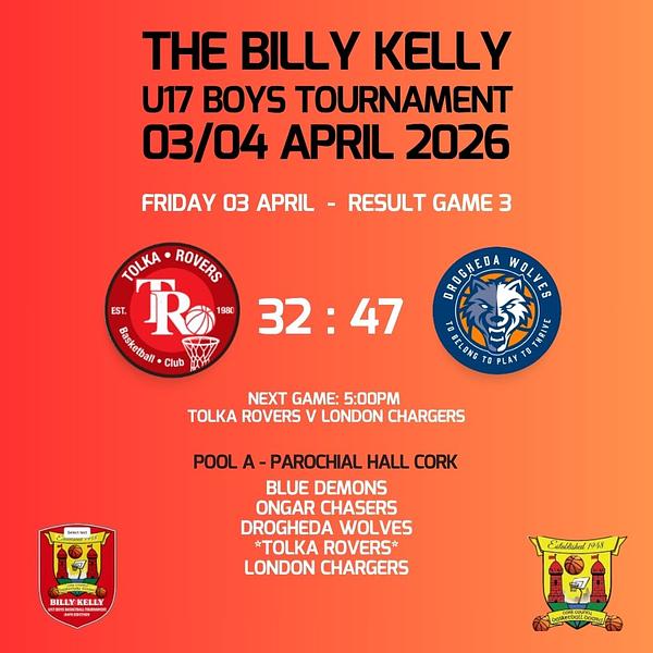 GAME 3 update from the Billy Kelly Tournament at Parochial Hall, Gurranabraher, Co Cork. The Tolka Rovers U17 Boys lost their third of 4 games they will play today against Drogheda Wolves. Their last game for today, against the London Chargers, is running late and is scheduled to tip at 5:00 pm.